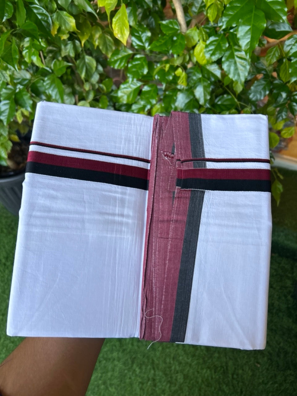 DMK Veshti - 20% DISCOUNT! KaithariKada 100% Cotton PURE WHITE Double Mundu/Dhoti - 100X100 - 1 inch Black & Maroon kara - 1KK5102ASH