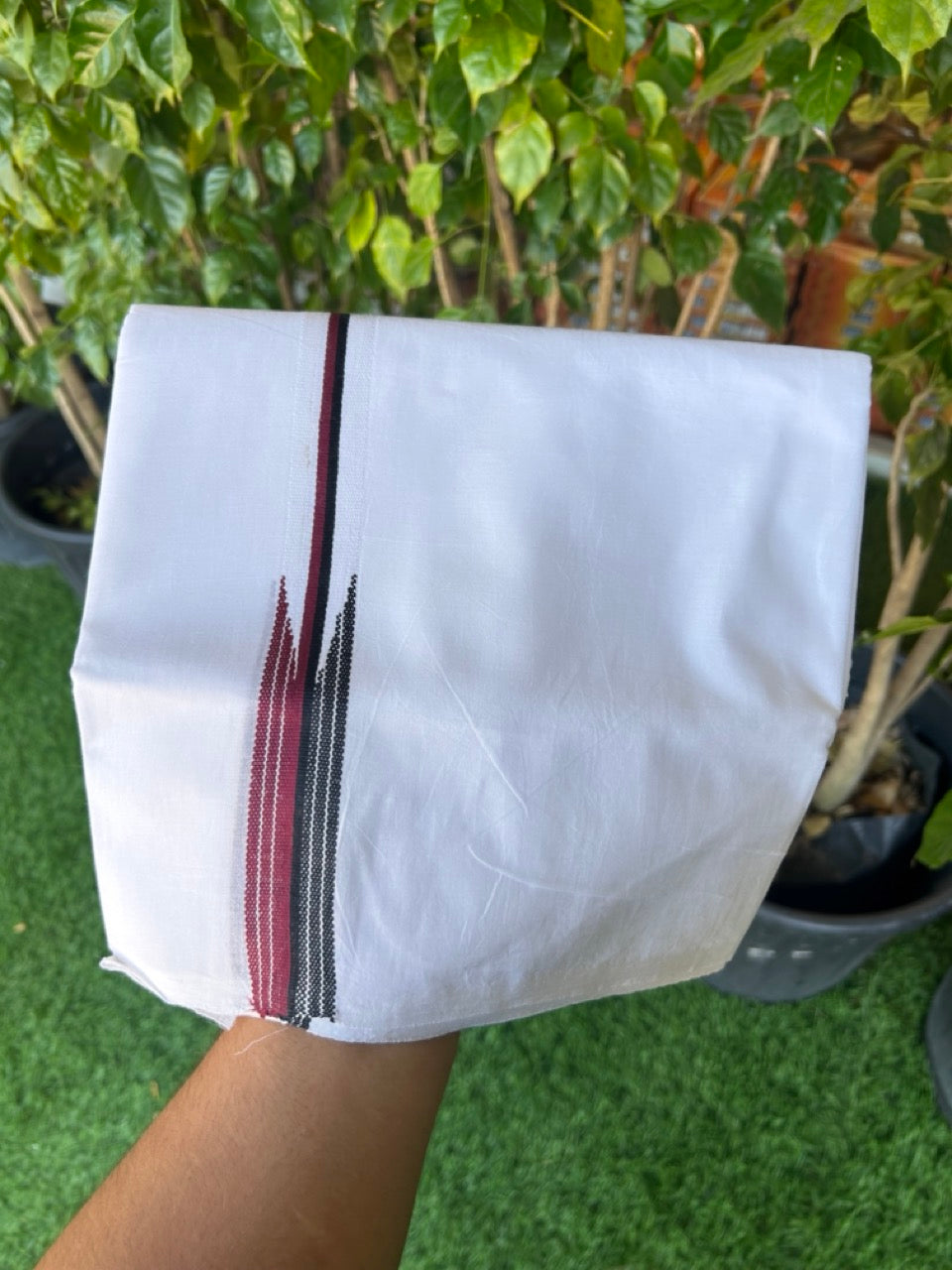 DMK VESHTI SHORT DHOTHI - DMK Veshti - 20% DISCOUNT! KaithariKada Balaramapuram 100% Cotton Double PURE WHITE Mundu/Dhoti-100x100 - 1.25 inch & 46 inches Height Puliyilakkara MAROON & BLACK Striped Chutty Kara- 13KK5146ASH