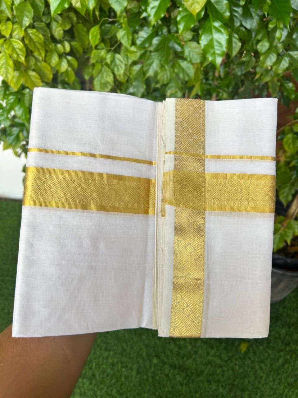 HANDLOOM Pure SILK Dhoti NEW! 25% DISCOUNT from Kaitharikada.com - BALARAMAPURAM Handloom Unakkupaav - Pure White - Double Mundu/Dhoti - 100x100 - Pure cotton + Silk - 1.5 inch Gold Kasavu Designer Kara - 1KK5206 ABH