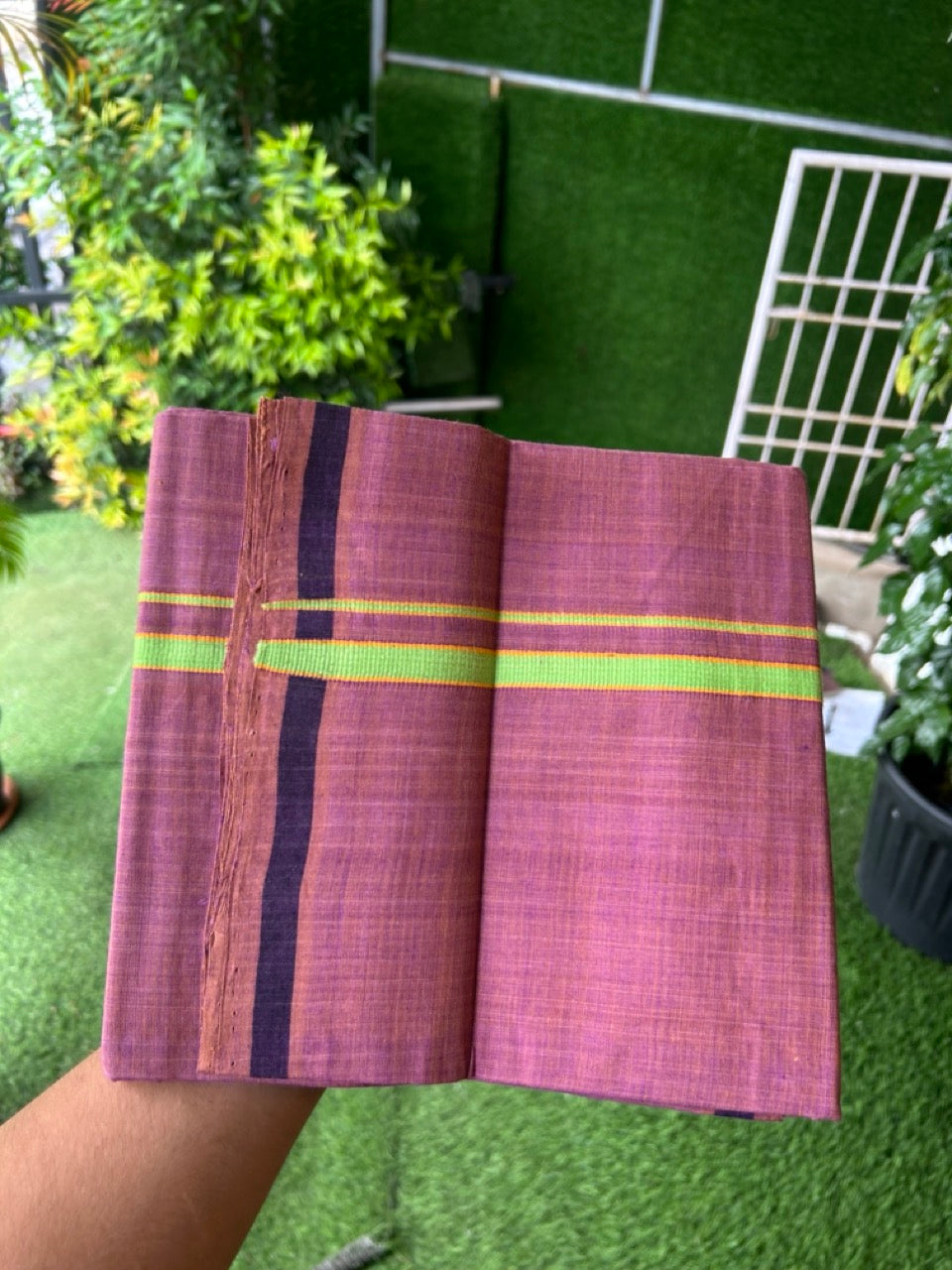 Handloom Single Hallmarked - 10% Discount !! KaithariKada 100% Pure Cotton - Mundu/Dhoti - Onion Pink Body - 0.5 inch Parrot Green & Orange Stripes Kara- (2 meter / 4 muzham) - 52 KK8032 ELA