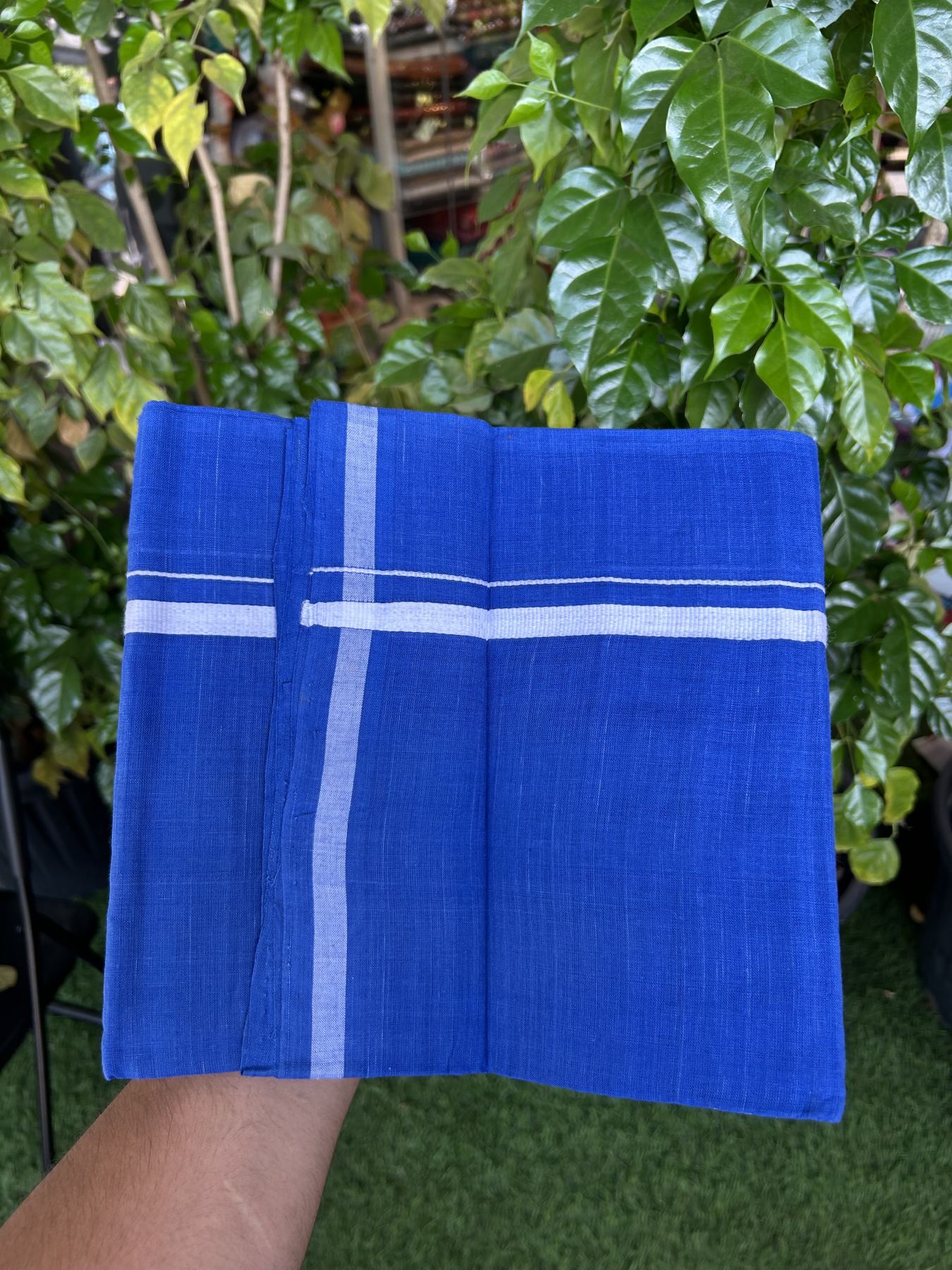 Kerala Handloom Single Hallmarked - 10% Discount !! KaithariKada 100% Pure Cotton - Mundu/Dhoti Blue Body - 1.5 cm White Kara - (2 meter / 4 muzham) - 39 KK8048 ELA