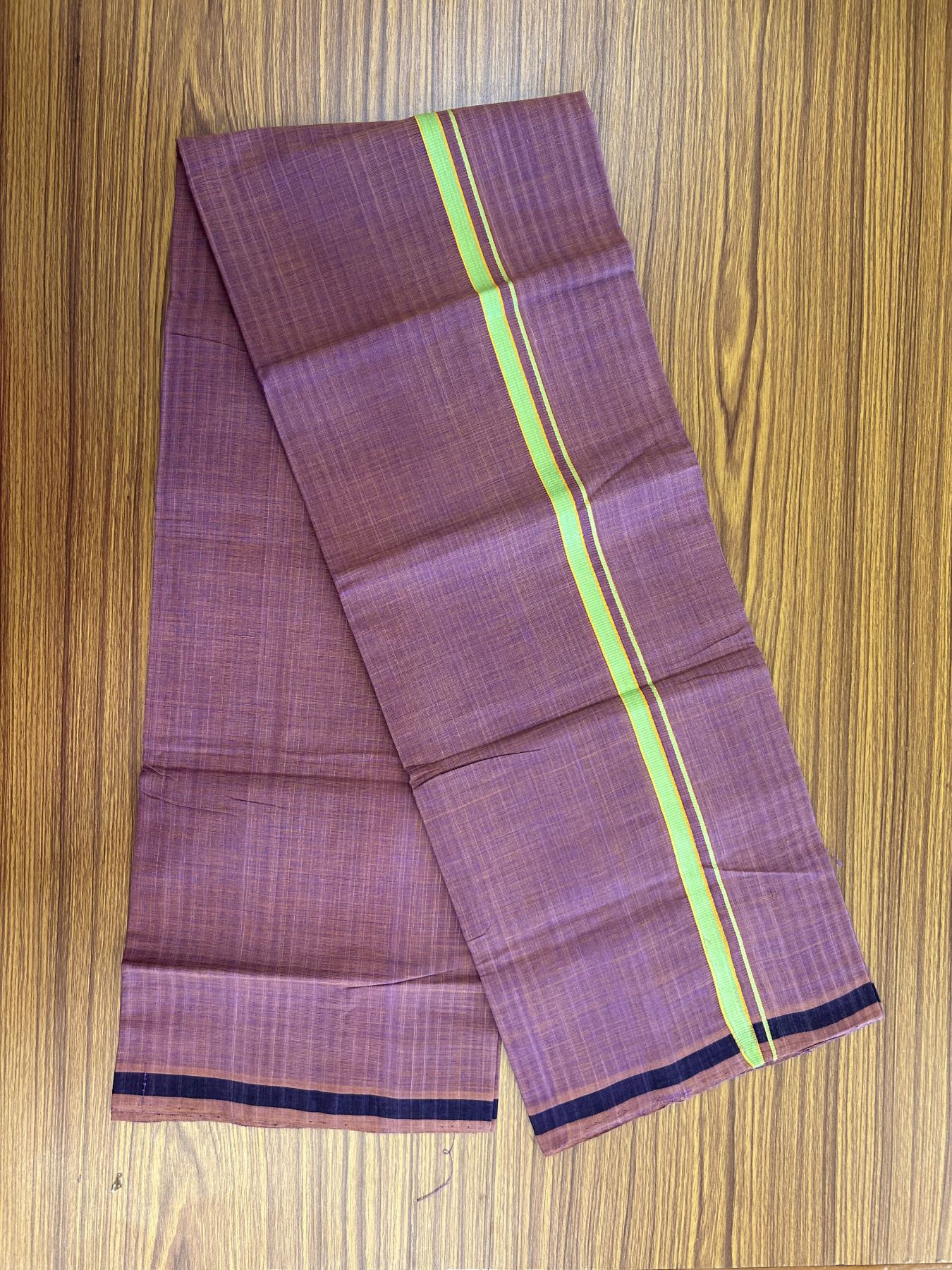 Kerala Handloom Single Hallmarked - 10% Discount !! KaithariKada 100% Pure Cotton - Mundu/Dhoti Purple Brown Body - 1.5 cm Green & Yellow Stripes Kara - (2 meter / 4 muzham) - 44 KK8048 ELA