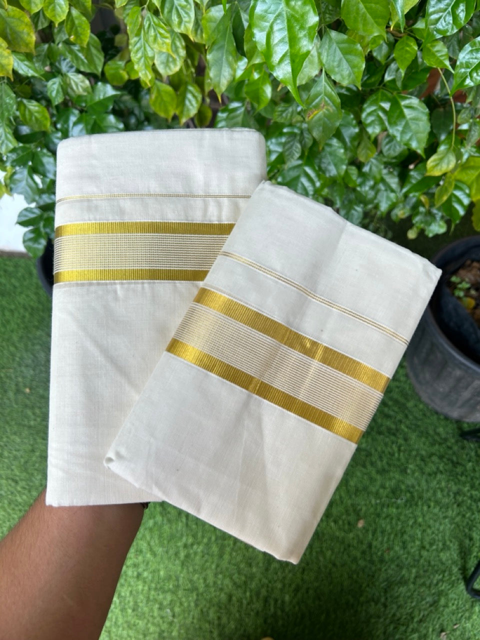 20% Discount!! KaithariKada Balaramapuram - 100% PURE Cotton Off White (Unbleached) Mundu/Dhoti & Neriyath set - 1.5 Inch Kasavu Stripes Kara - 1KK5213 VIN