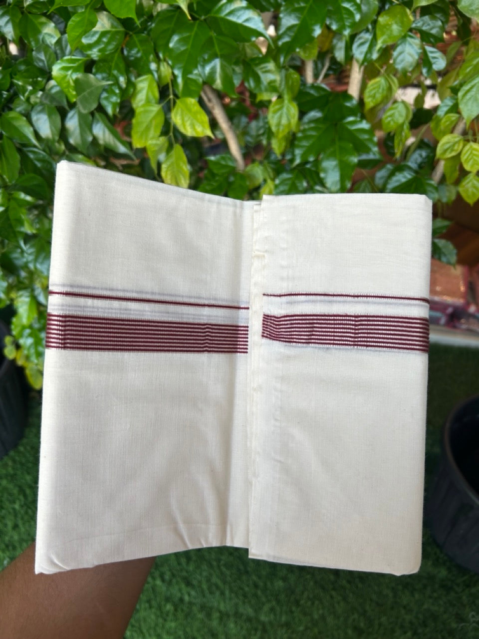 NEW !! 20% DISCOUNT!! KaithariKada Balaramapuram 100% Cotton Double Off white - (Unbleached) Mundu/Dhoti-100x80 - 0.75 inch Silver Kasavu & Maroon Striped KARA - 3.75 mtr (8 Muzham) - 42KK5218 ASH