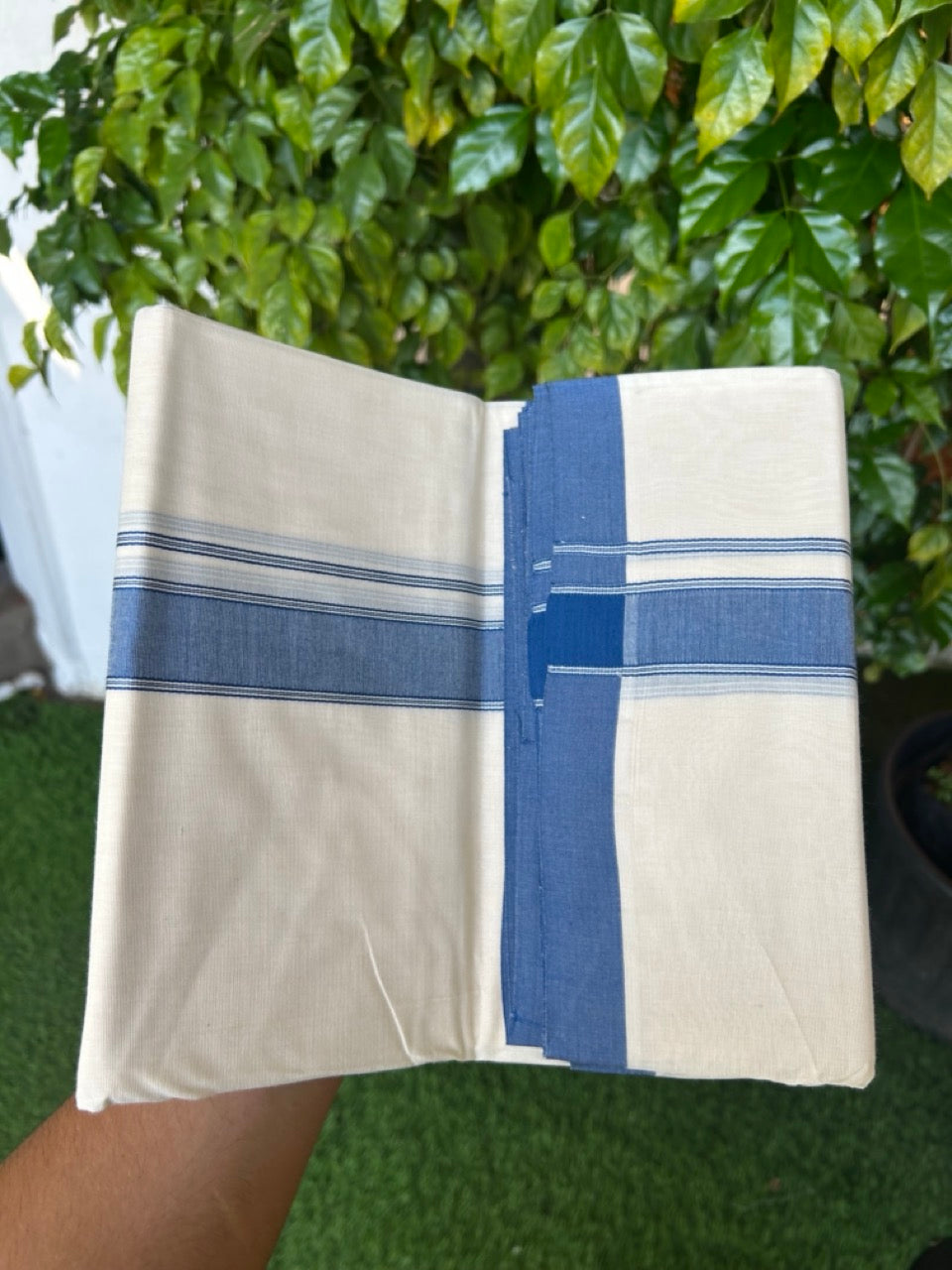 NEW !! 20% DISCOUNT!! KaithariKada Balaramapuram 100% Cotton Double Off white - (Unbleached) Mundu/Dhoti-100x80 - 1.25 inch Blue Shaded Striped KARA - 3.75 mtr (8 Muzham) - 15KK5218 ASH