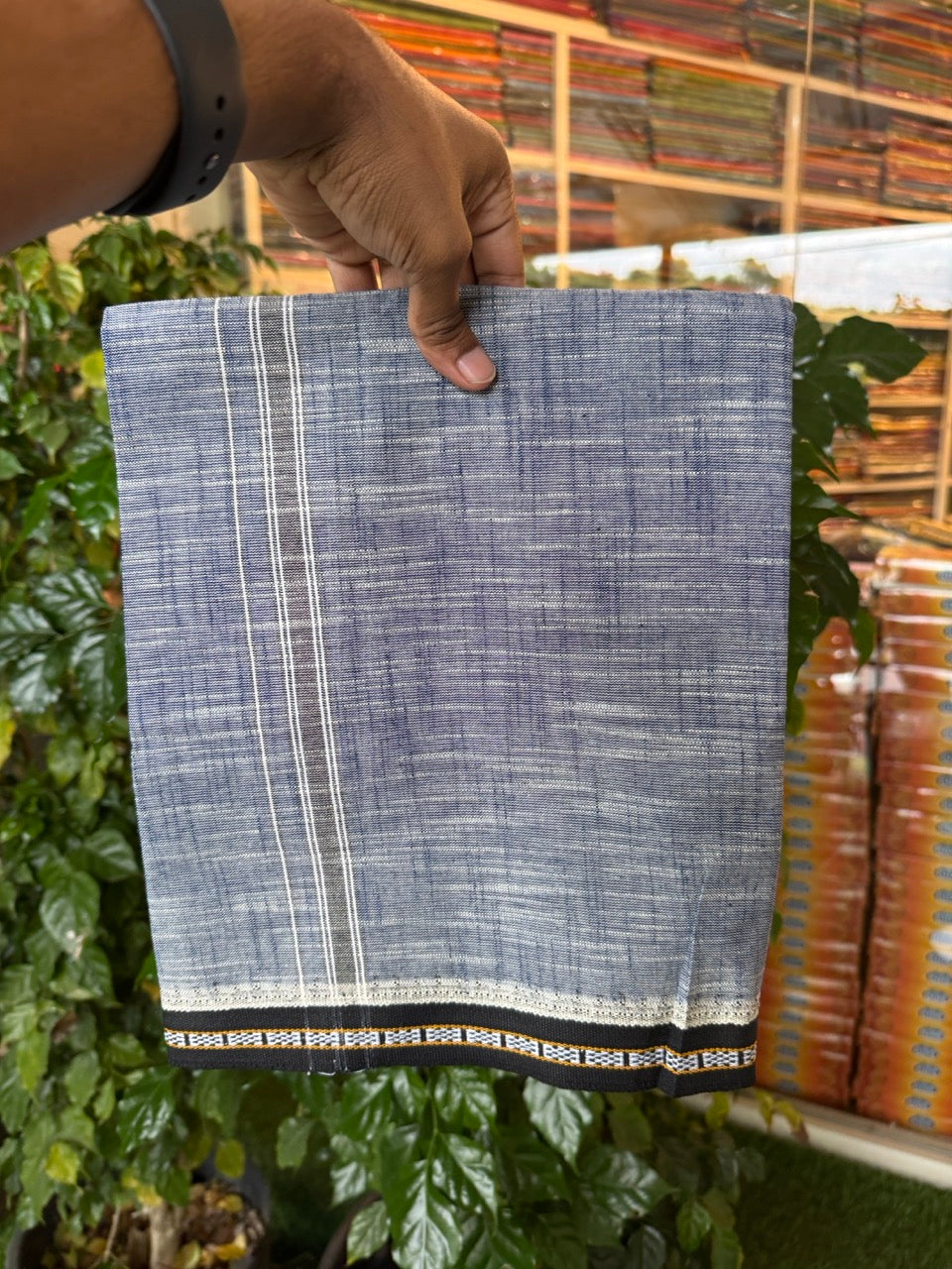 Premium Kathar Type Mund Pure cotton - Kaitharikada - Single Kaily / Lungi - 1.25 inch Black Kara kuppadam Border with Navy Blue White Shaded colour body (2 meter / 4 muzham)- 8 KK8031 MUT