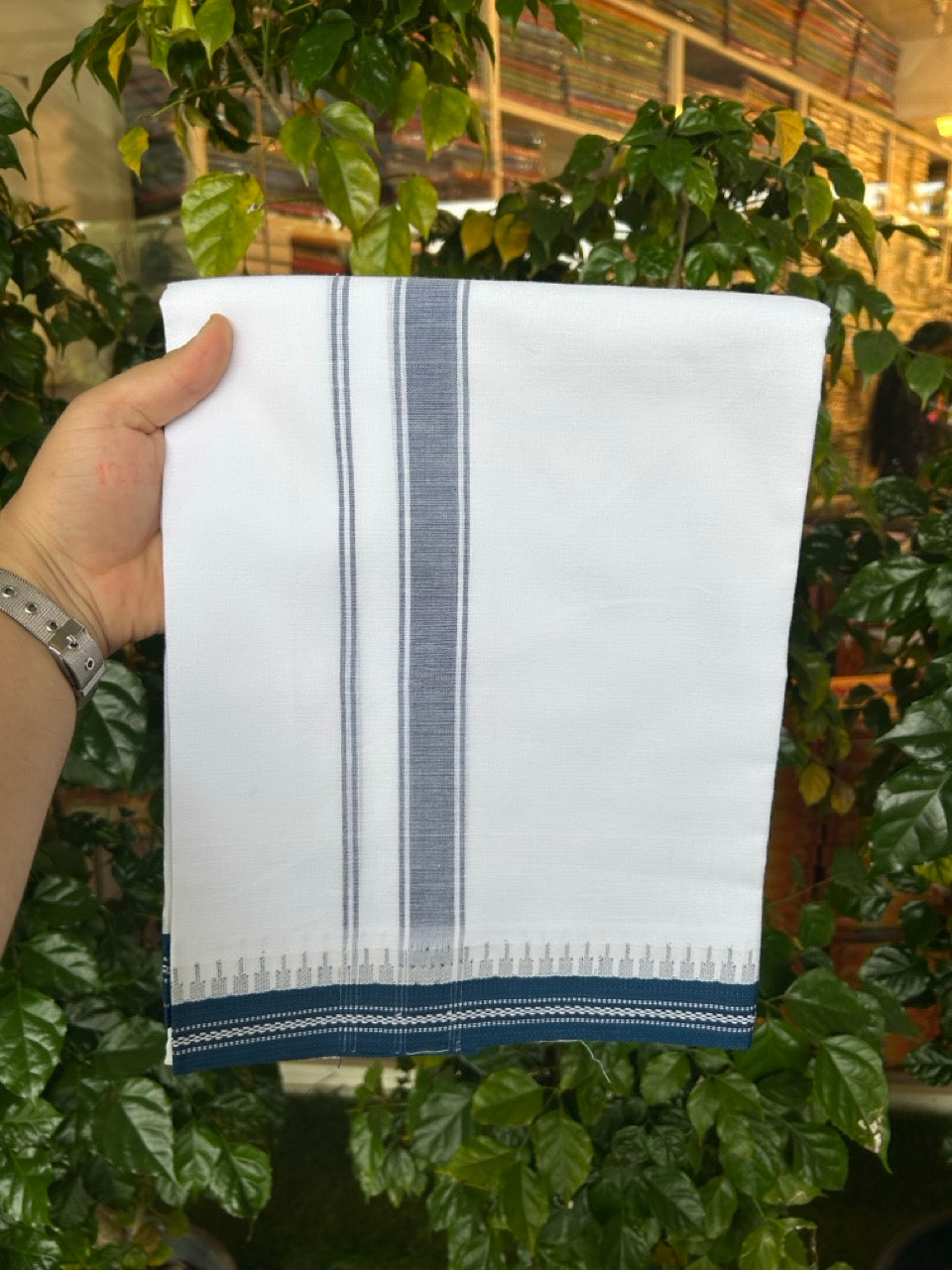 Premium Kathar Type Mercerised Pure Cotton Single Mund Kaitharikada Special - Kaily / Lungi - 1.25 inch Blue Striped kara White Body Kuppadam Border (2 meter / 4 muzham) - 2 KK8031 MUT