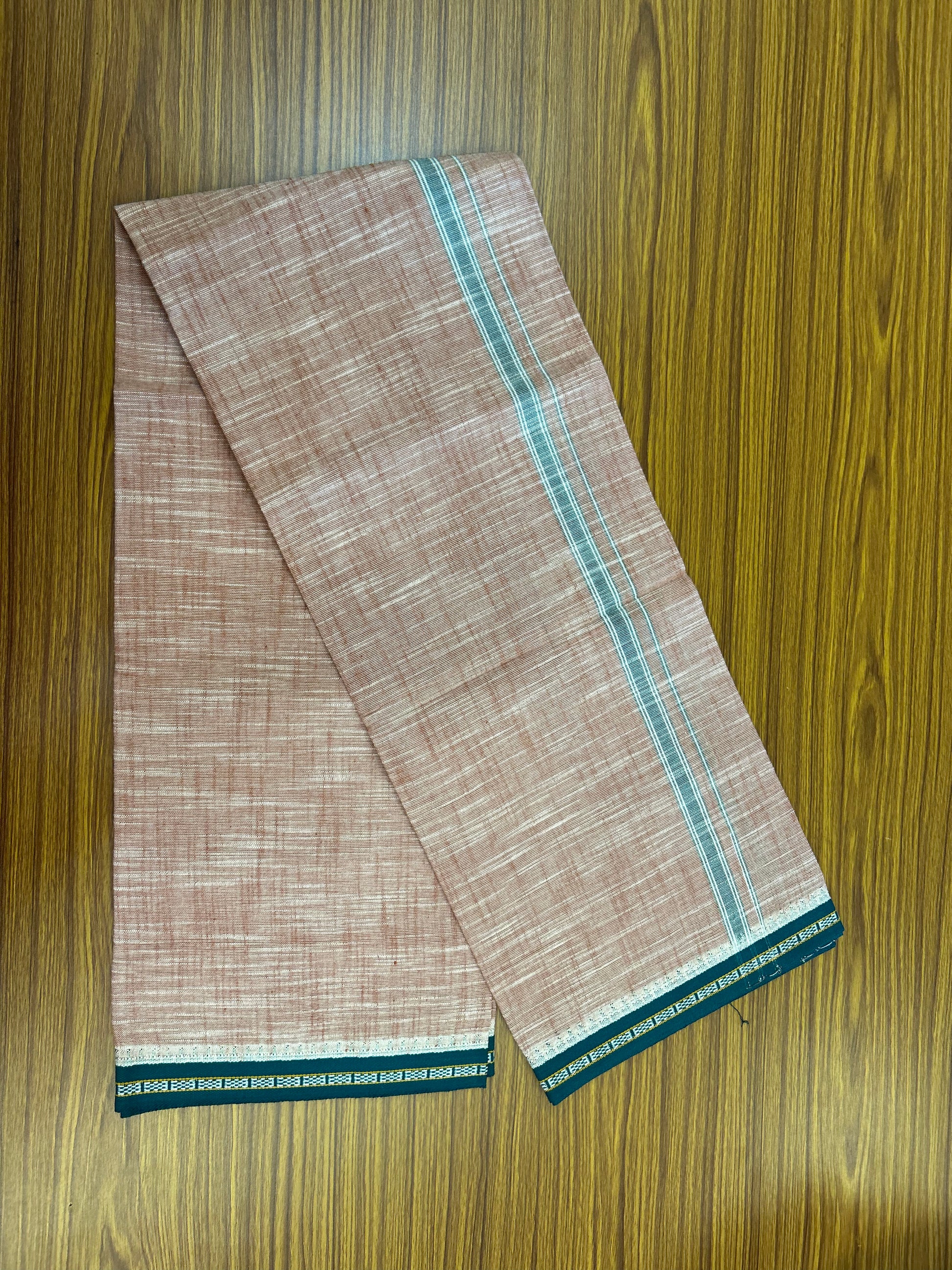 Premium Kathar Type Mund Pure cotton - Kaitharikada - Single Kaily / Lungi - 0.75 inch Green White Kara and Green kuppadam Border with Peach White Shaded colour body (2 meter / 4 muzham)- 16 KK8052 MUT
