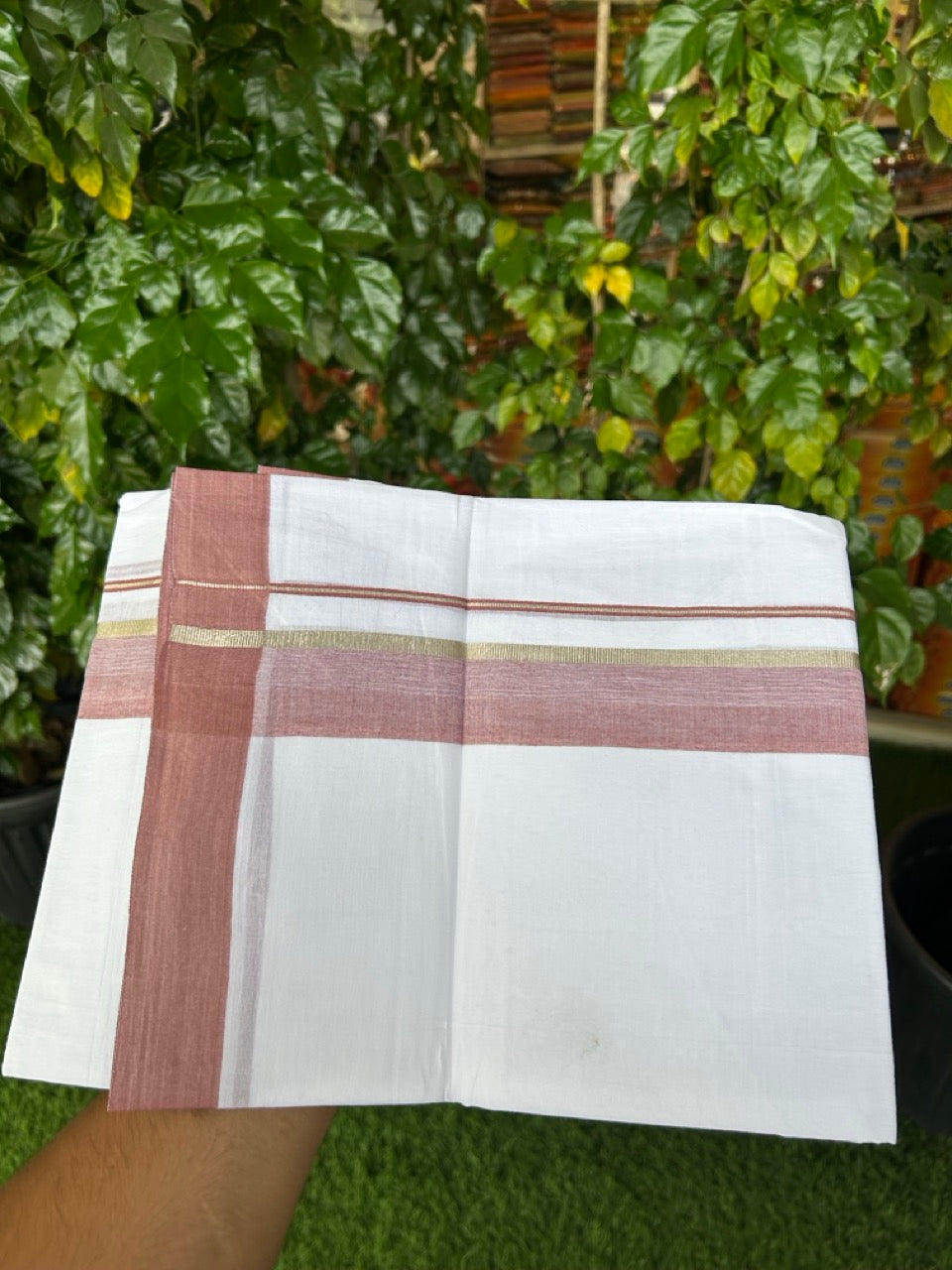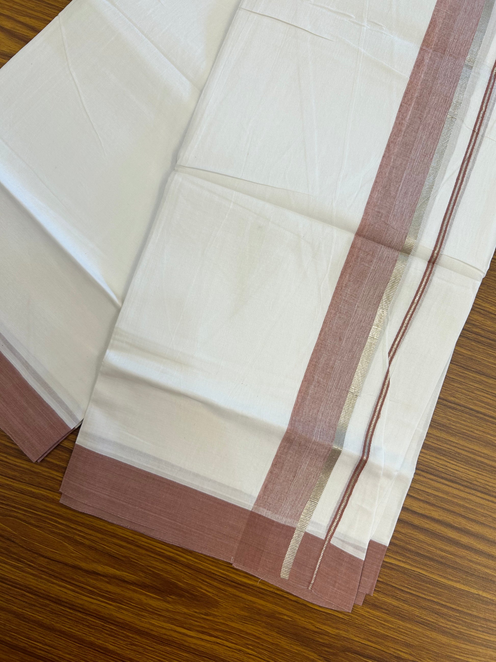 Short Dhoti Special - 28% Discount ! KaithariKada 100% Cotton Pure White Double Mundu / Dhoti - 100x80 - 45 inch Height 3.80 m Length 1.5 inch Brown Maroon Silver Kasav kara - 9 KK 5256 THI