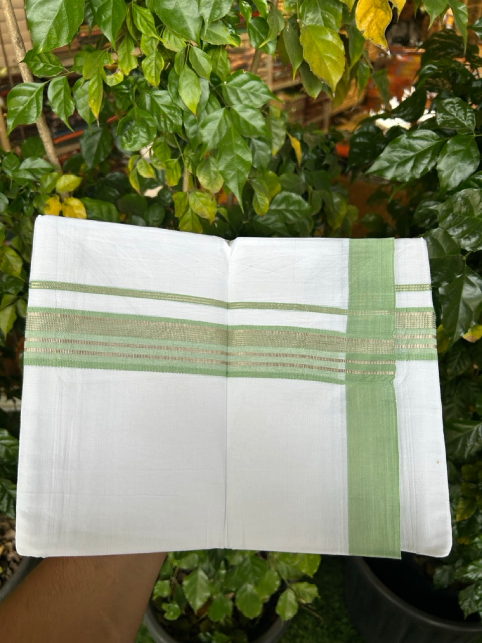 Short Dhoti Special - 28% Discount ! KaithariKada 100% Cotton Pure White Double Mundu / Dhoti - 100x80 - 45 inch Height 3.80 m Length 1.5 inch Light Green Silver Kasav kara - 7 KK5258 THI