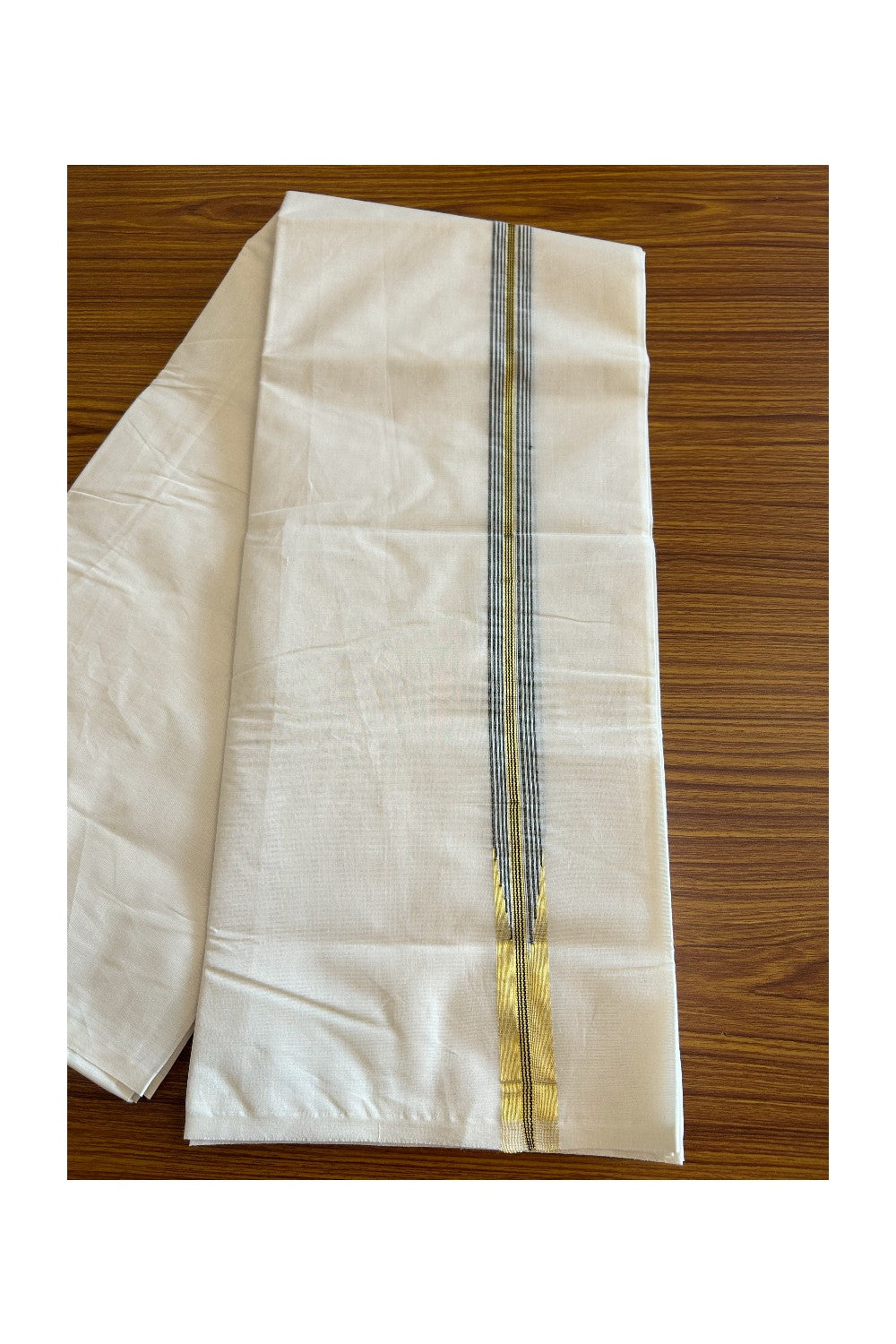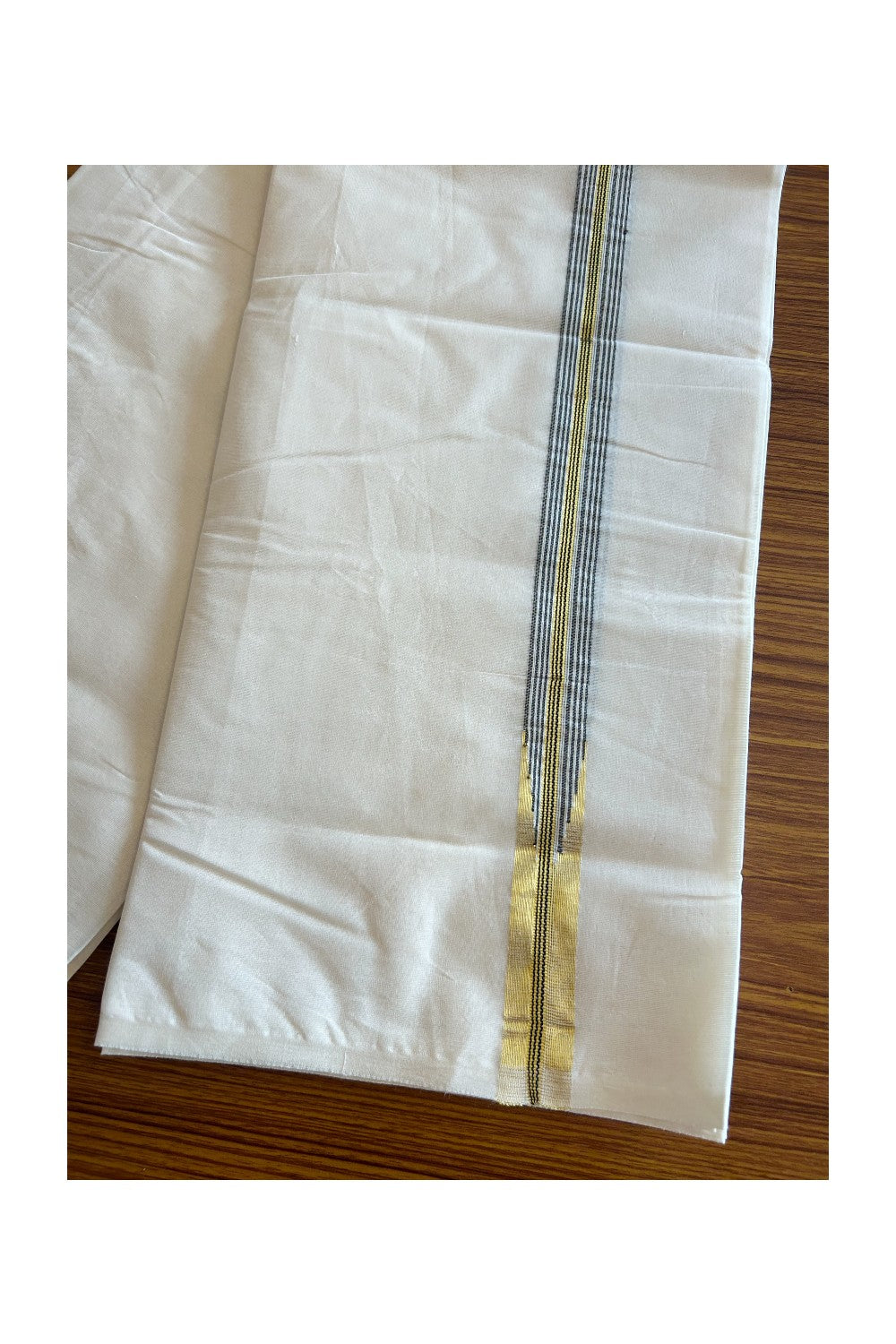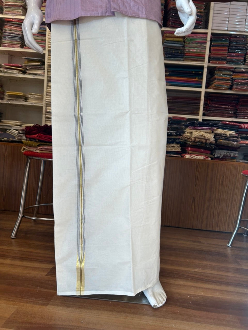 SHORT DHOTI SPECIAL! Kaitharikada.com - 26% Discount! Balaramapuram Double Off white - (Unbleached) Mundu/Dhoti - 100X100 - 1 inch Kara & 46 inches Height Puliyilakkara Chutty Gold Kasavu & Black Striped Design Kara - 2KK5090ASH