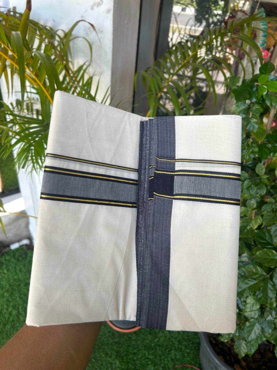 SHORT DHOTI SPECIAL! Kaitharikada.com 30% DISCOUNT! KaithariKada Balaramapuram 100% Cotton Off white (Unbleached) Double Mundu/Dhoti-100x100 - 1.5 inch Kara & 46 inches Height Navy Blue & Kasavu Striped Kara- 8KK5179ASH